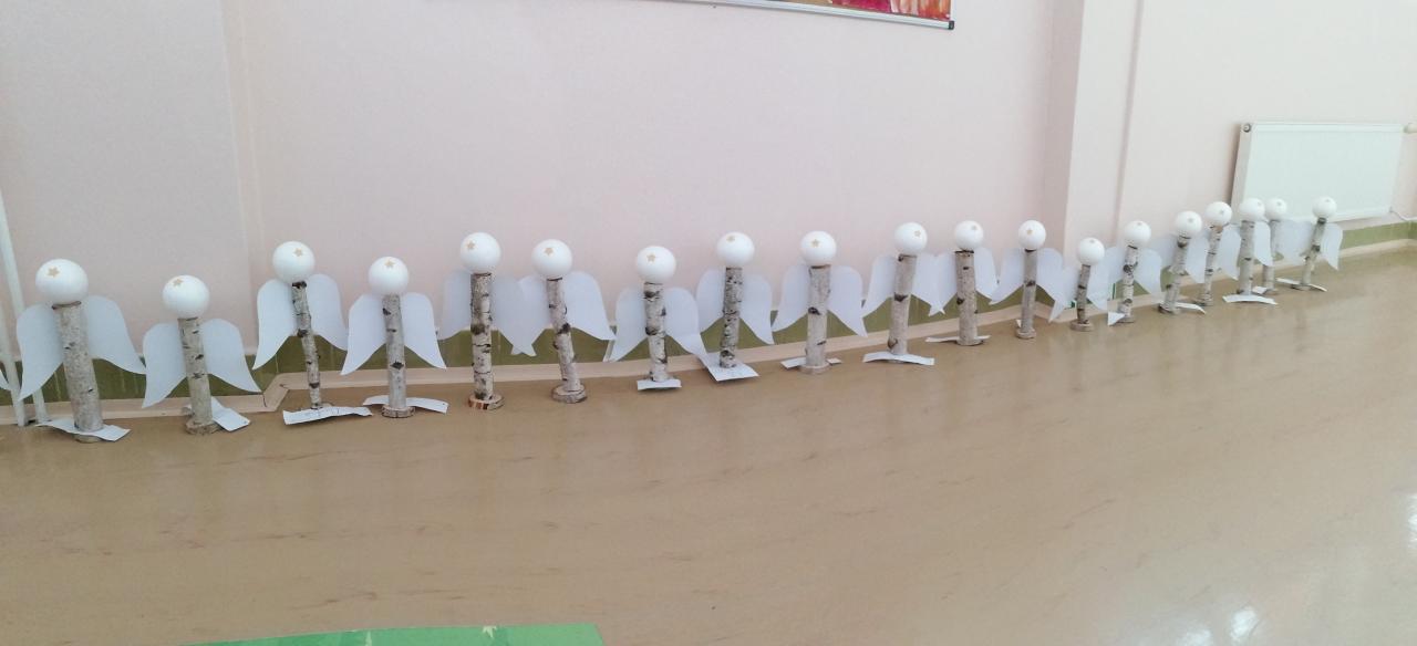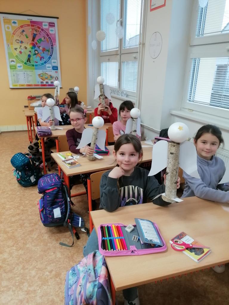 Upevnit větev z břízy do svěráku. Uříznout asi 30 cm dlouhý kus. K němu na jednu stranu přibít dřevěnou kruhovou podložku. Na druhou stranu přilepit hlavu z polystyrenové koule. Z papíru vystřihnout křídla a hvězdičku. Pak vše nalepit na anděla.
