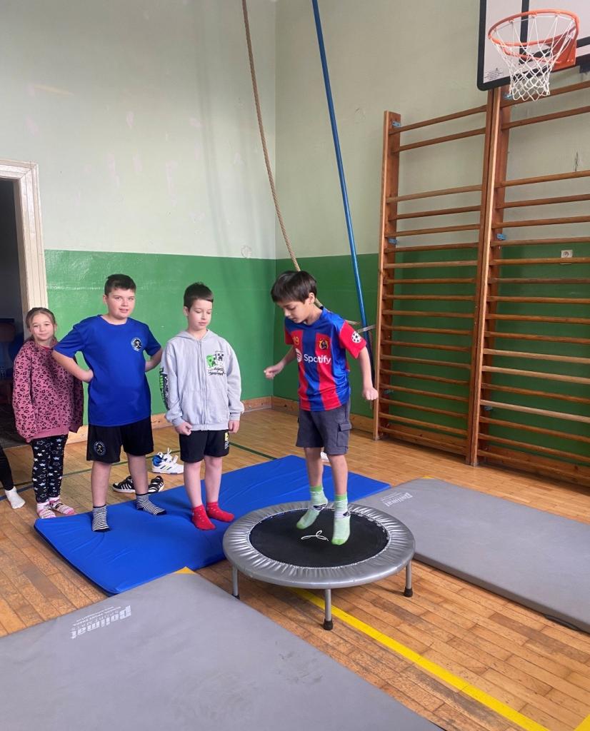 V rámci tělesné výchovy jsme se věnovali cvičení na trampolínách.
