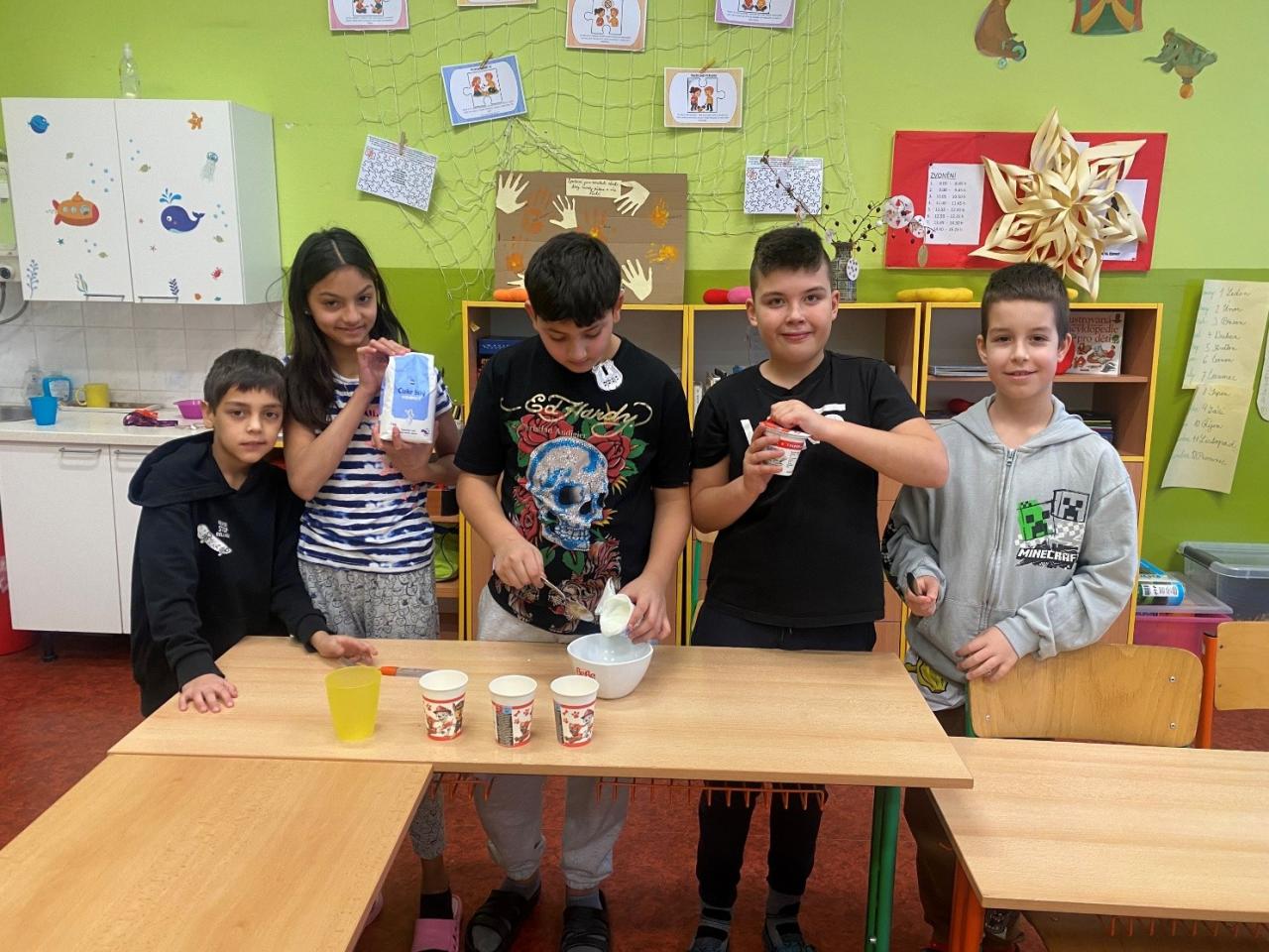 Součástí programu byl rovněž ochutnávkový den mléčných výrobků, které nám jsou dodávány v rámci projektu Svačiny do škol. Připravili jsme si tvaroh smíchaný s jogurtem, který jsme dle vlastní chuti lehce přisladili.