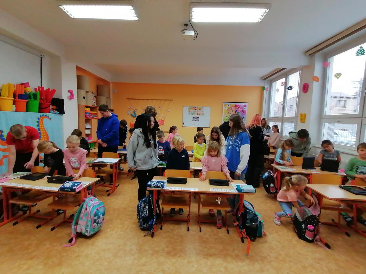 O přestávku k nám do třídy přišli deváťáci. Prvňáčci si vybrali velkého kamaráda a ti jim s připojením pomohli. Spustili tablety, přihlásili žáky k programu, vybrali s nimi ikonu, označili je jménem. A prvňáčci mohli začít. Zabrali se do práce a počítali a počítali. I při této činnosti se ukázalo, jak kdo umí počítat. Tato hodina se všem líbila a žáci se těší na další.