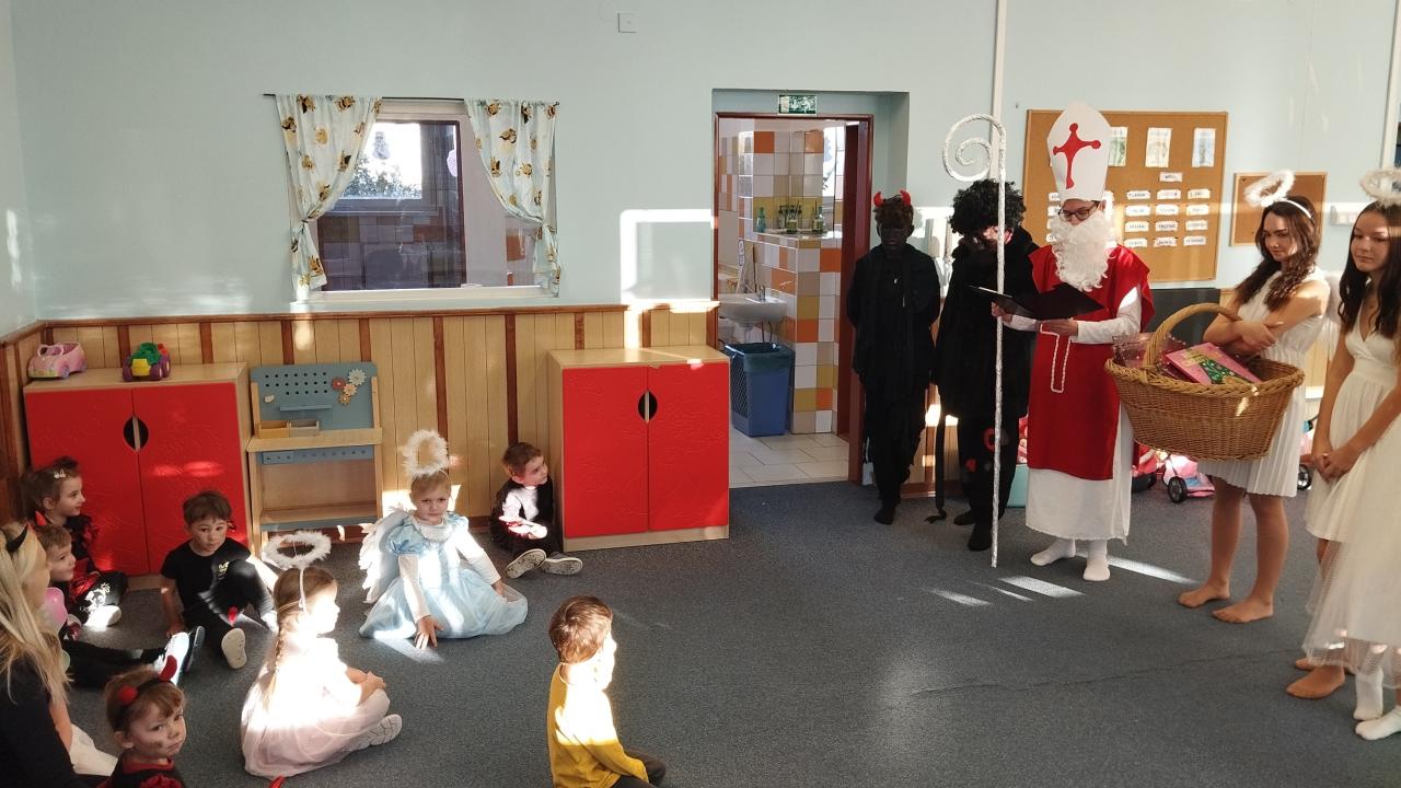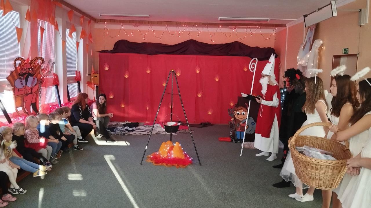 Dne 5. prosince se sedm z nich vydalo do školky, aby tam dětem připravili mikulášskou nadílku. Některé děti se trošku bály, ale nakonec všechny odvážně řekly básničku nebo zazpívaly písničku a vysloužily si odměnu. Některé děti, které jsou občas neposlušné, si plácly s čertem a přislíbily, že se polepší. Zaběhli i na 2. stupeň do školy, aby i starší žáci, věděli, že Mikuláš je sleduje. Naši deváťáci se skvěle ujali role Mikuláše, andělů a čertů.
